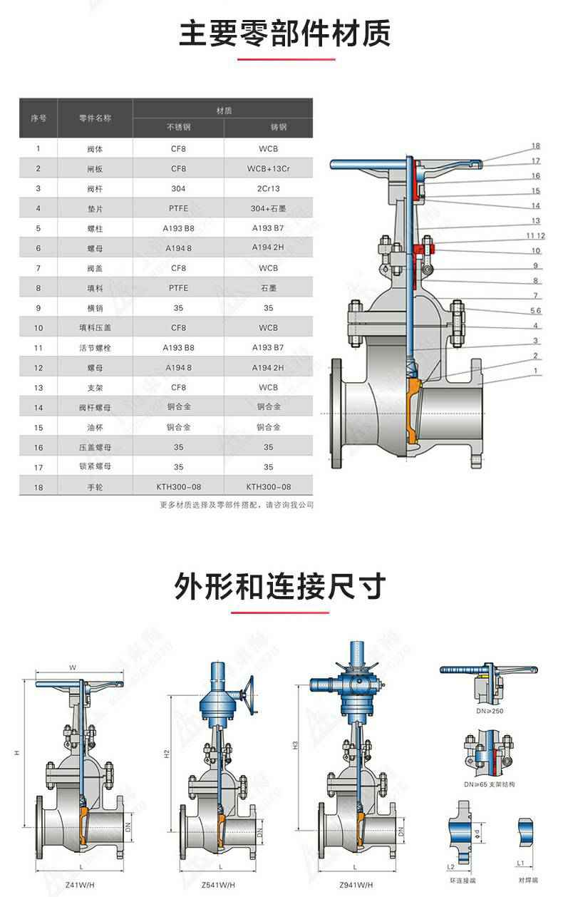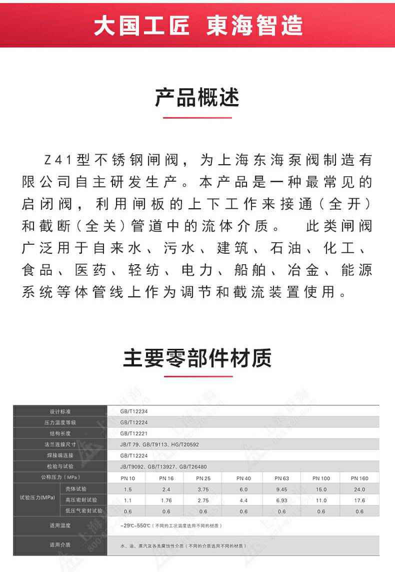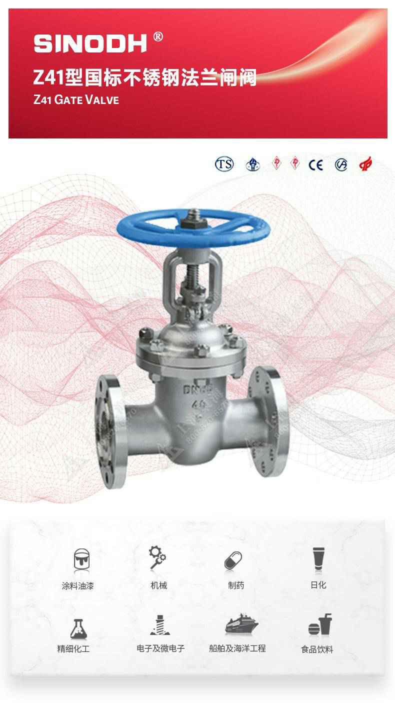 Z41型不锈钢闸阀,为长沙逍遥企业经营服务有限公司自主研发生产。本产品是一种最常见的启闭阀,利用闸板的上下工作来接通(全开)和截断(全关)管道中的流体介质。此类闸阀广泛用于自来水、污水、建筑、石油、化工、食品、医药、轻纺、电力、船舶、冶金、能源系统等体管线上作为调节和截流装置使用。
