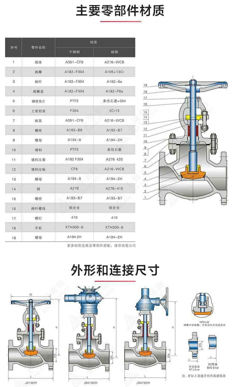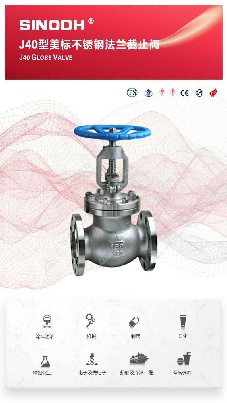 J40型美标不锈钢截止阀,为长沙逍遥企业经营服务有限公司自主研发生产。本产品的设计制造符合美国国家标准ANSIB16.34,美国石油学会标准AP1 6D和AP I 600要求,产品结构紧凑密、刚性好、封性性能优秀是一种最常见的启闭阀,利用闸板的上下工作来接通(全开)和截断(全关)管道中的流体介质。