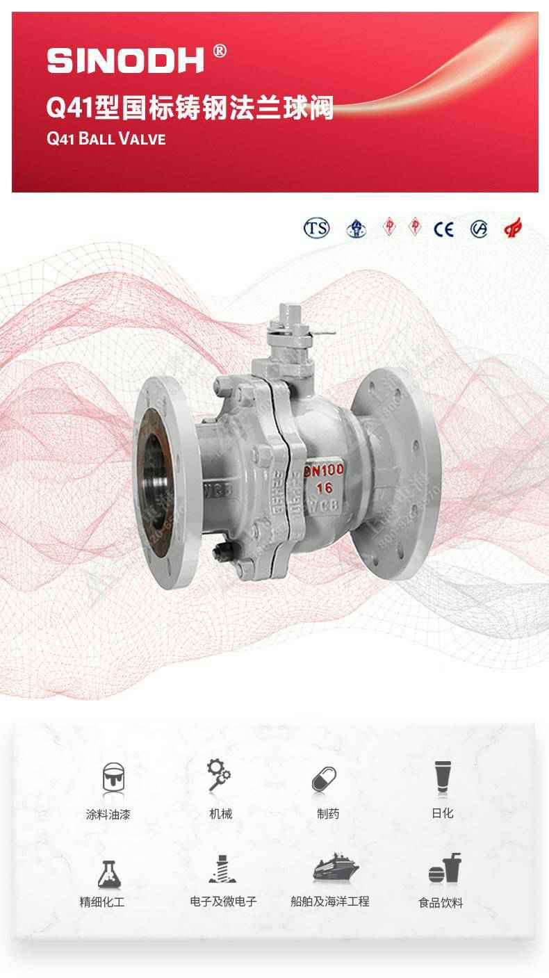 Q41型国标铸钢法兰球阀,为长沙逍遥企业经营服务有限公司自主研发生产。本产品设计制造标准符合GB/T12237、GB/T12224标准。该产品的球体在介质压力作用下球体能产生一定的位移并紧压在出口端的密封面上,保证出口端密封。适用于水、溶剂、酸和天然气等一般工业介质也适用于工况恶劣的介质,如氧气、过氧化氢、甲烷和乙烯等介质。